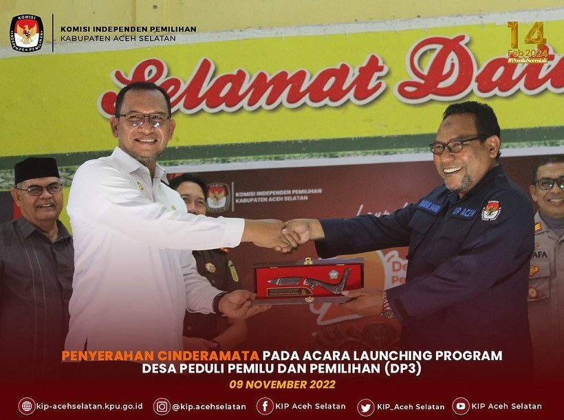 Tapaktuan - KIP Aceh Selatan menyelenggarakan kegiatan launching Desa Peduli Pemilu dan Pemilihan pada rabu 9 November 2022 di Rumoh Agam. Kegiatan tersebut bertujuan untuk membangun kesadaran politik masyarakat menjadi pemilih yang mandiri dan rasional serta meningkatkan kualitas dan kuantitas partisipasi pemilih.