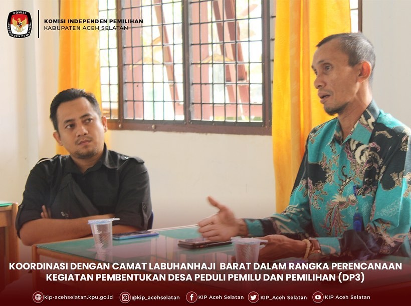 #TemanPemilih, KIP Kabupaten Aceh Selatan Melakukan Koordinasi dengan Camat Labuhanhaji Barat Dalam Rangka Perencanaan Kegiatan Pembentukan Desa Peduli Pemilu dan Pemilihan (DP3), Kamis (30/06)