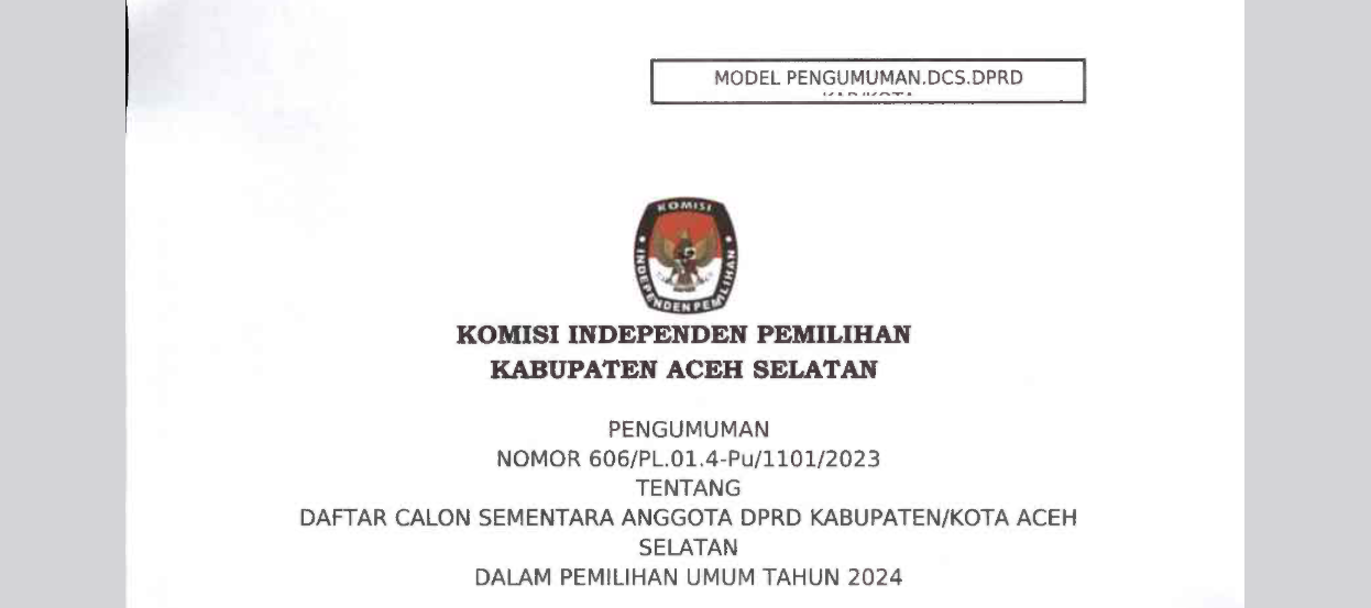 Pengumuman DAFTAR CALON SEMENTARA Anggota DPRK Aceh Selatan Pemilu Tahun 2024