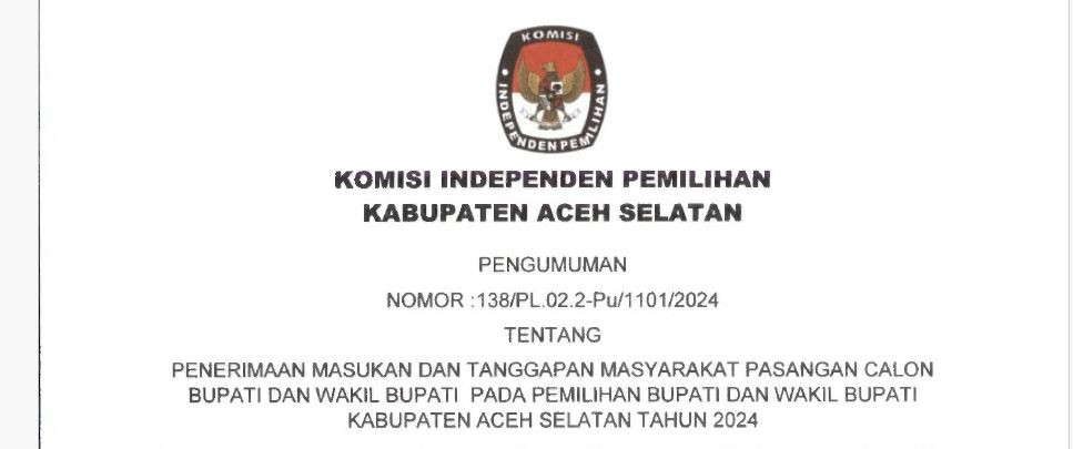 Bahwa untuk melaksanakan ketentuan Pasal 137 Peraturan KPU Nomor 8 Tahun 2024 tentang Pencalonan Gubernur dan Wakil Gubernur, Bupati dan Wakil Bupati, serta Walikota dan Wakil Walikota yang telah diubah dengan Peraturan KPU Nomor 10 Tahun 2024 tentang Perubahan Atas Peraturan KPU Nomor 8 Tahun 2024 tentang Pencalonan Gubernur dan Wakil Gubernur, Bupati dan Wakil Bupati, serta Walikota dan Wakil Walikota, Komisi Independen Pemilihan Kabupaten Aceh Selatan mengumumkan Penerimaan Masukan dan Tanggapan Masyarakat terhadap Pasangan Calon Bupati dan Wakil Bupati Kabupaten Aceh Selatan