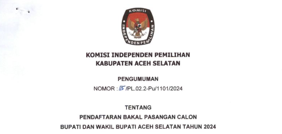 Pengumuman Pendaftaran calon Bupati dan Wakil Bupati Aceh Selatan Tahun 2024 dapat di baca pada dokumen dibawah ini