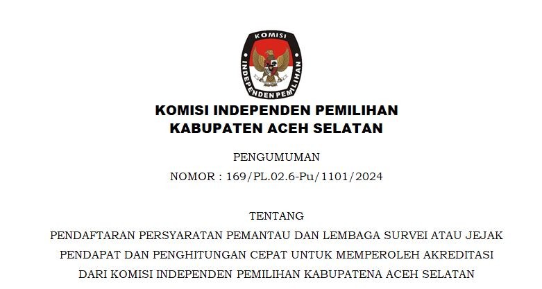 Dalam rangka melaksanakan ketentuan Pasal 17 ayat (1) dan (1) peraturan Komisi Pemilihan Umum Nomor 9 tahun 2022 tentan Partisipasi Masyarakat dalam Pemilihan Umum dan Pemilihan Gubernur dan Wakil Gubernur, Bupati dan Wakil Bupati, dan/atau Walikota dan Wakil Walikota dan Peraturan Komisi Independen Pemilihan Umum Nomor 2 Tahun 2024 tentang Tahapan dan Jadwal Pemilihan Gubernur dan Wakil Gubernur, Bupati dan Wakil Bupati, serta Walikota dan Wakil Walikota Tahun 2024, Komisi Independen Pemilihan Kabupaten Aceh Selatan menerima pendaftaran Lembaga Survei atau Jejak Pendapat dan Penghitungan Cepat pada Pemilihan Gubernur dan Wakil Gubernur, dengan ketentuan sebagai berikut: