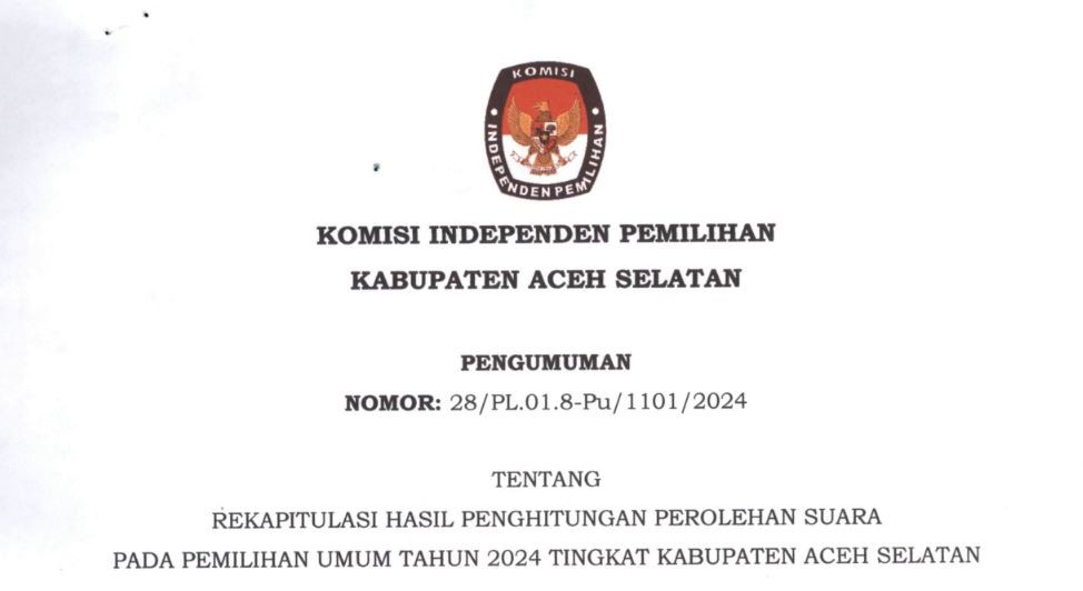 PENGUMUMAN REKAPITULASI HASIL PENGHITUNGAN PEROLEHAN SUARA PADA PEMILIHAN UMUM TAHUN 2024 KABUPATEN ACEH SELATAN Kamis, 07 Maret 2024 02:00 1610 Berikut kami lampirkan dokumen D Hasil Kabupaten setiap jenis pemilihan 1. Presiden dan Wakil Presiden Download 2. DPR RI Download 3. DPD Download 4. DPRA Download 5. DPRK Download Bagikan: Dilihat 1,610 Kali.
