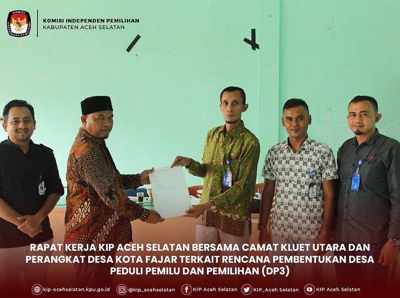 #TemanPemilih, KIP Kabupaten Aceh Selatan mengadakan Rapat Kerja dengan Kecamatan Kluet Utara. Rapat kerja ini terkait dengan rencana pembentukan Desa Pwduli Pemilu dan Pemilihan (DP3) dengan pembicara untuk penjelasan tentang DP3 oleh Bapak Sudarman Syarif, ST selaku Divisi Sosialisasi, Pendidikan Pemilihan Partisipasi Masyarakat KIP Kabupaten Aceh Selatan. Rapet kerja dibuka langsung oleh Bapak Camat Kluet Utara di kantor Camat Kluet Utara yang dihadiri oleh perangkat desa Kota Fajar.#KPUMelayani#PemiluSerentak2024