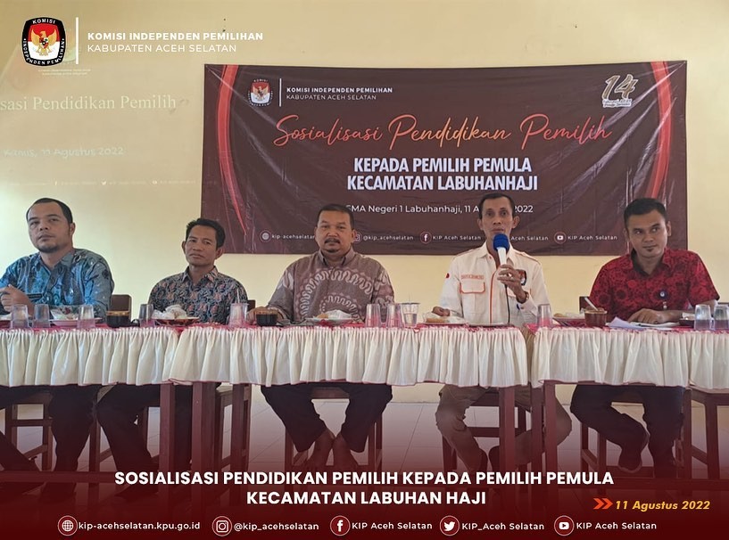 Kegiatan sosialisasi dihadiri oleh 50 siswa yang dilaksanakan di SMAN 1 Labuhanhaji. Dibuka langsung oleh Ketua KIP Aceh Selatan Saiful,SE dengan mengikutsertakan tiga Narasumber yaitu dari Disdukcapil Aceh Selatan Iwan Masdi, Penyuluh Narkoba Ahli Muda BNNK Aceh Selatan Nisfurrahman, SKM, dan Anggota KIP Aceh Selatan Sudarman Syarif, ST.